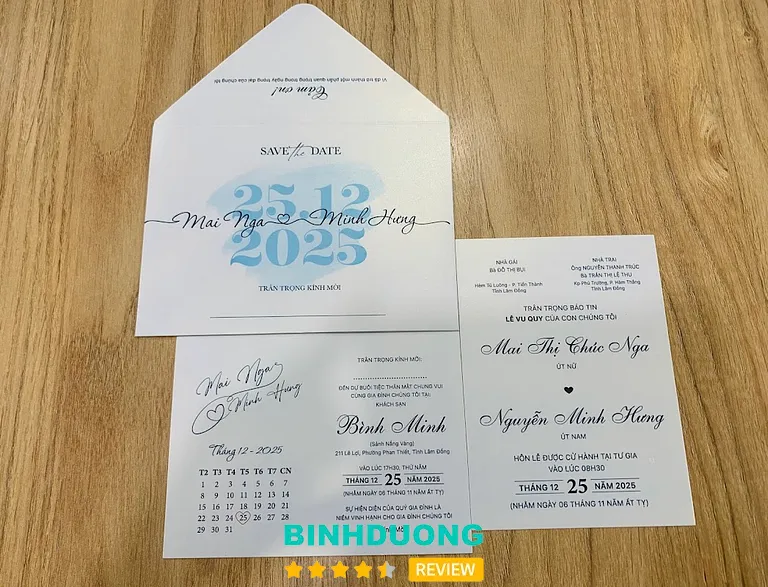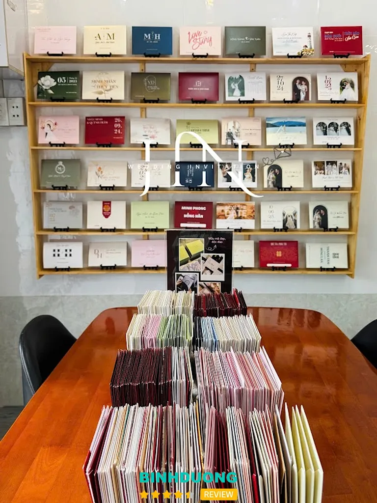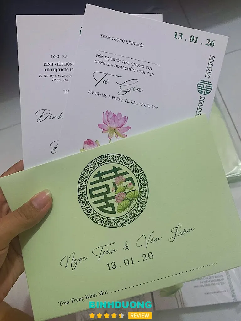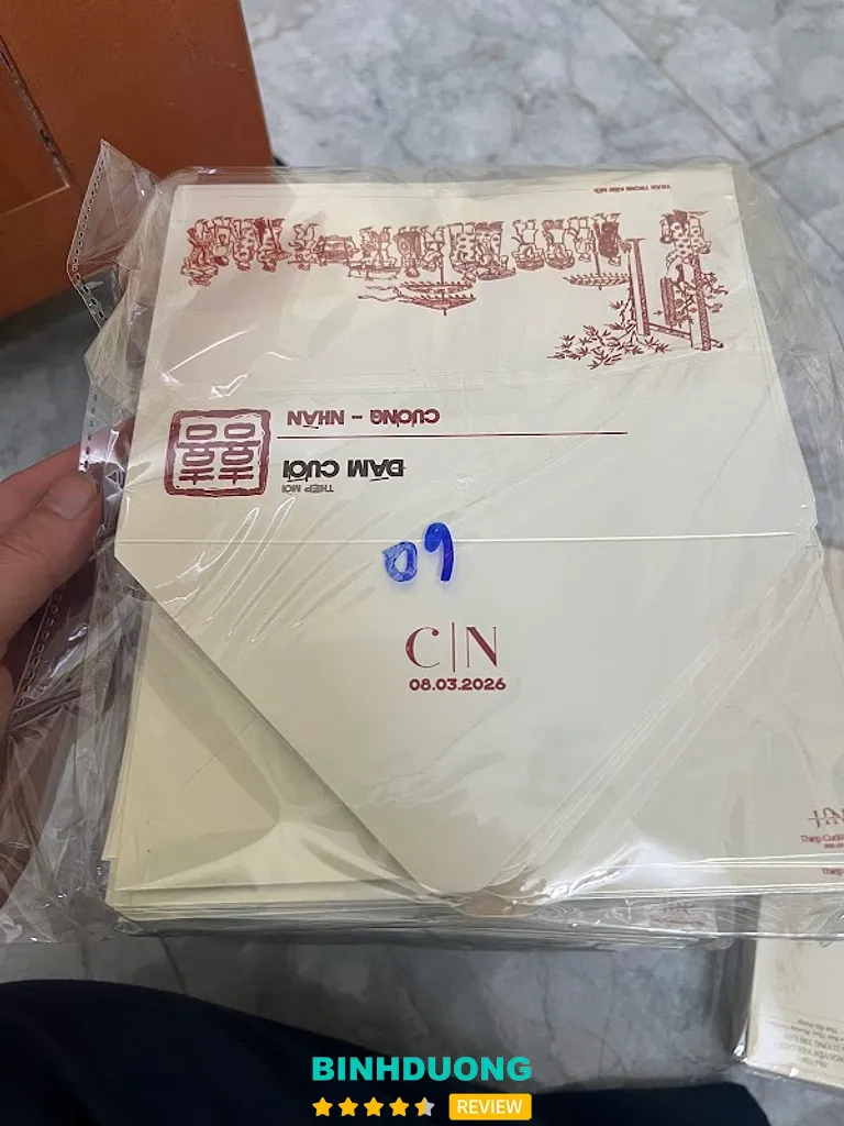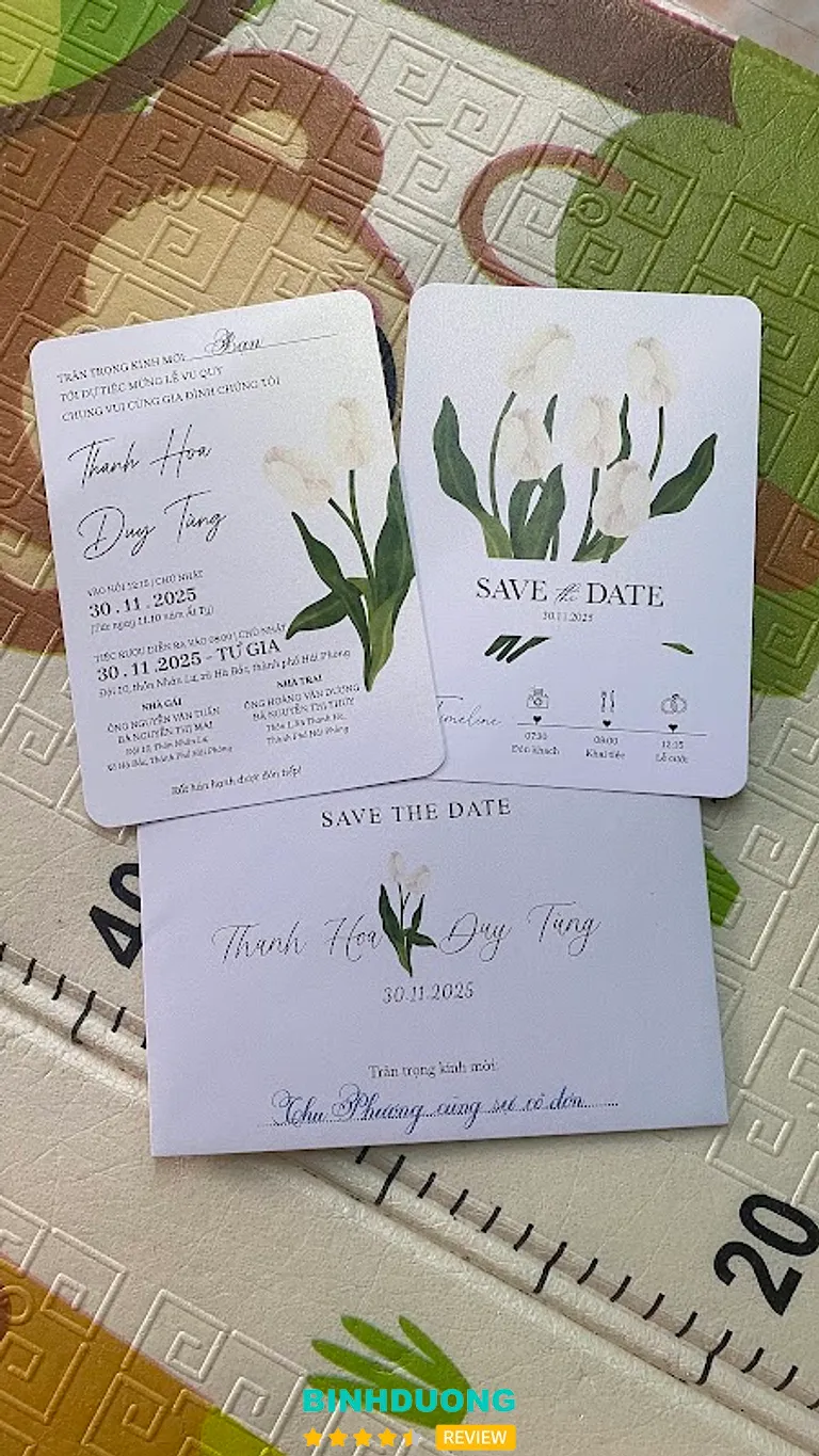 Cửa hàng có mặt tại khu vực Dĩ An – một vị trí thuận tiện để khách hàng từ Bình Dương hoặc TP. Hồ Chí Minh dễ dàng đến xem mẫu và đặt thiệp trực tiếp. Theo dữ liệu đánh giá trực tuyến, cửa hàng đang duy trì mức đánh giá cao 4.9/5 với hơn 50 đánh giá, cho thấy sự hài lòng lớn từ khách hàng.